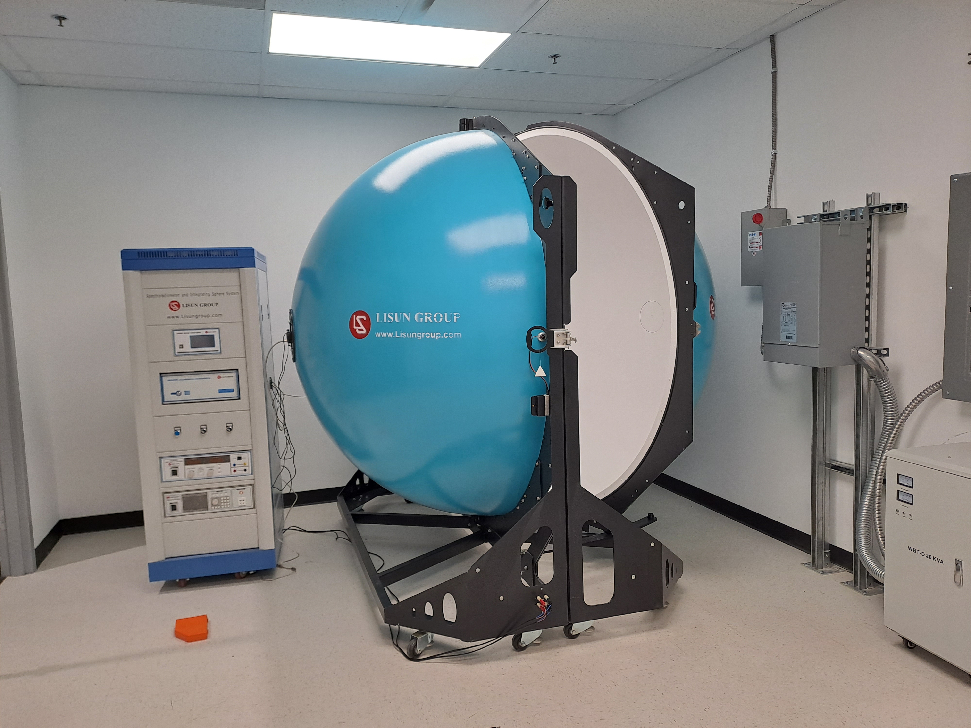 The two-meter integrating sphere creates precise LED measurement data. This system is more accurate than a traditional photometer and reports lumen output, color temperature, color rendering index, chromaticity, and binning accuracy.